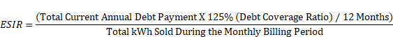 (b) ESIR Calculation: Inside City Limits. The Electric System Improvement Rider rate will be calculated monthly by taking the total current annual debt payment for the system improvements times 125% (as required to cover the debt service coverage ratio), then divided by 12 months to give the monthly total amount needed to be collected for the month, followed by then dividing the total by the actual kWh sold across entire system. This rate will be taken times the actual kWh consumed during a billing month by all customers.
